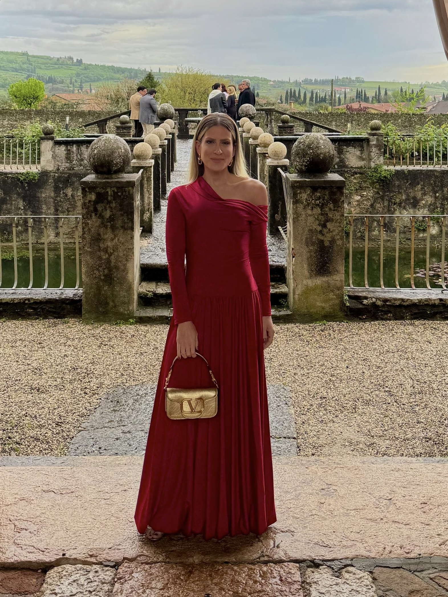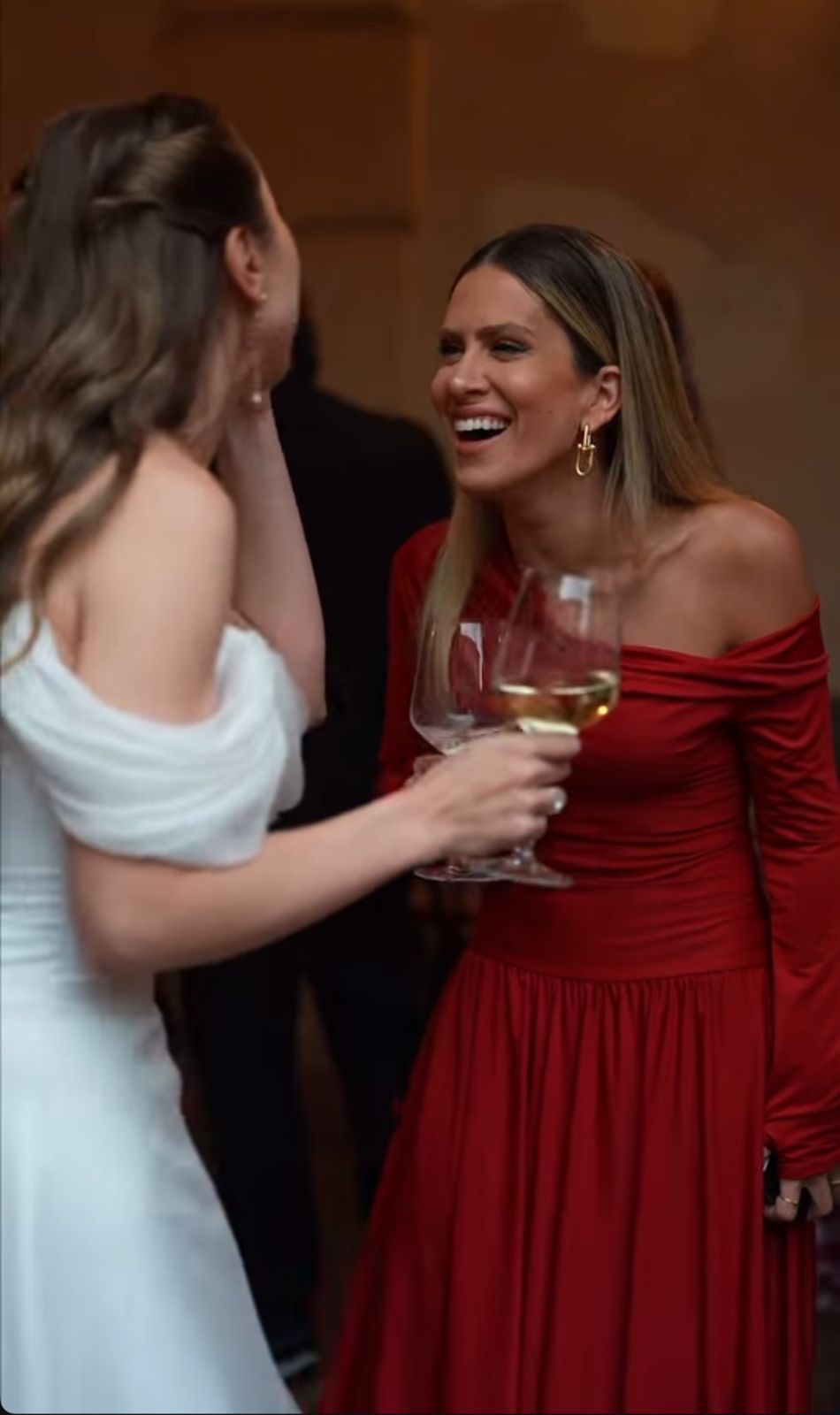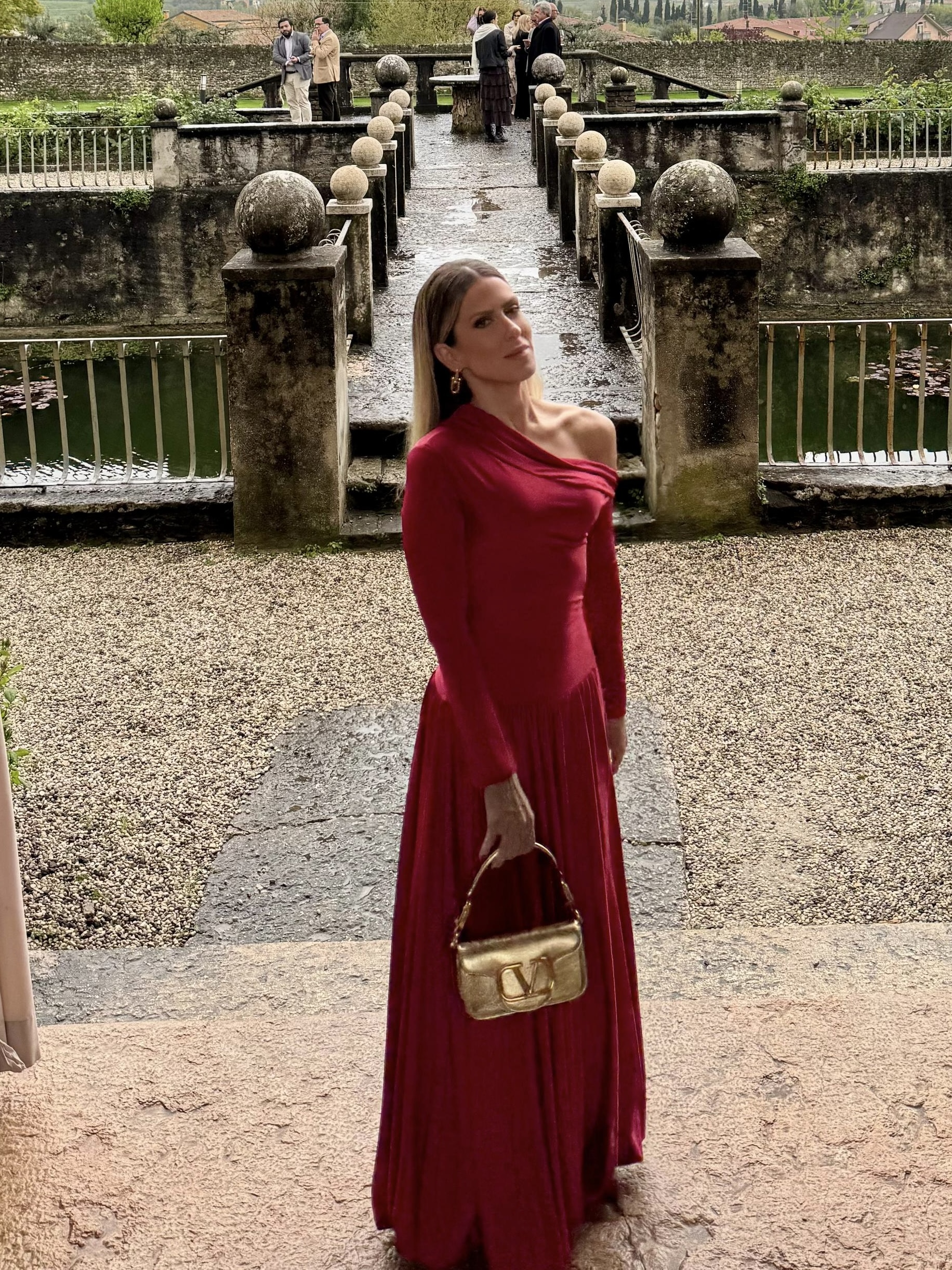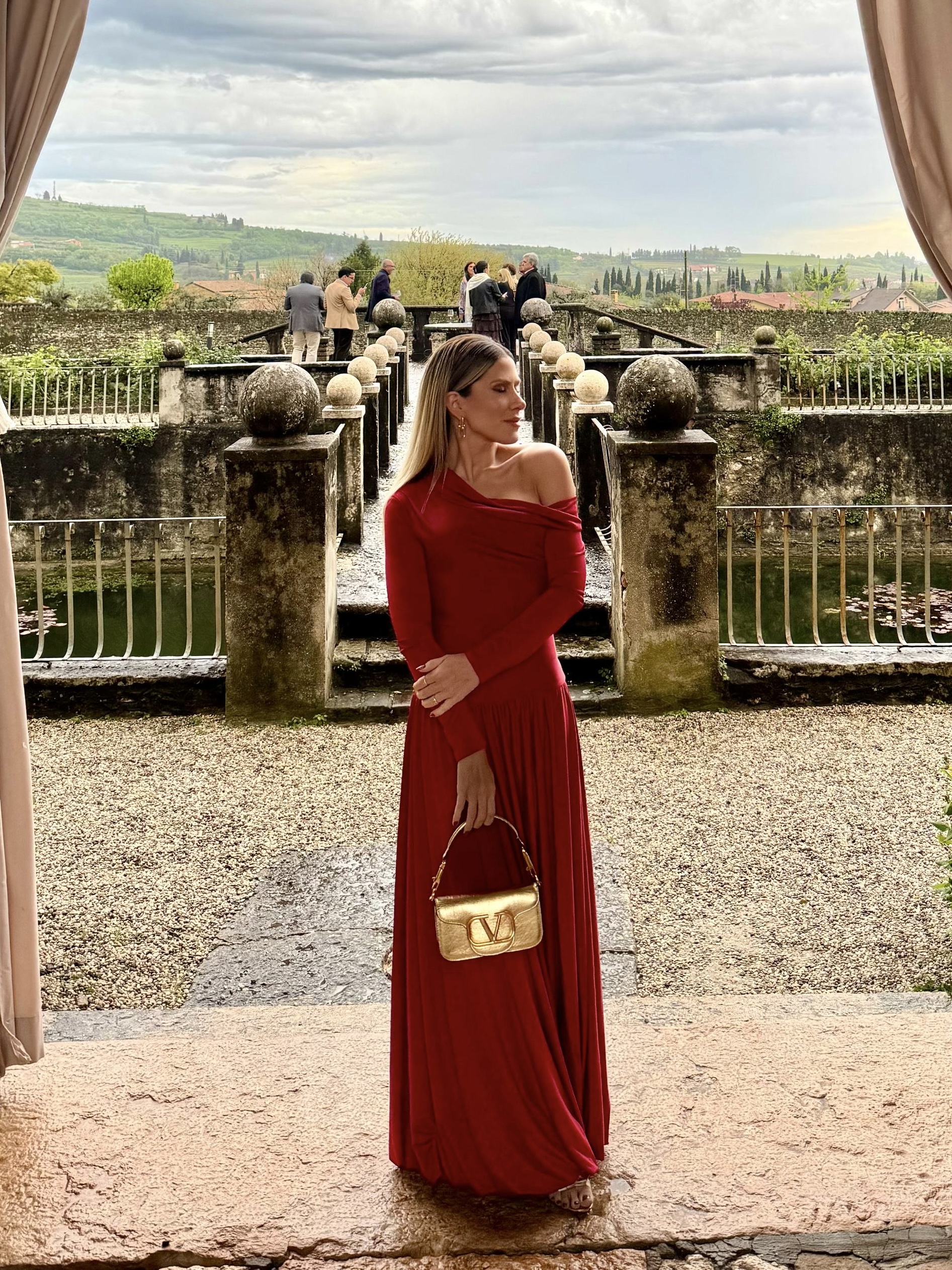 Tem um ombro caído do lado esquerdo, deixando o ombro à mostra e dando um toque final de charme ao que já é belo.