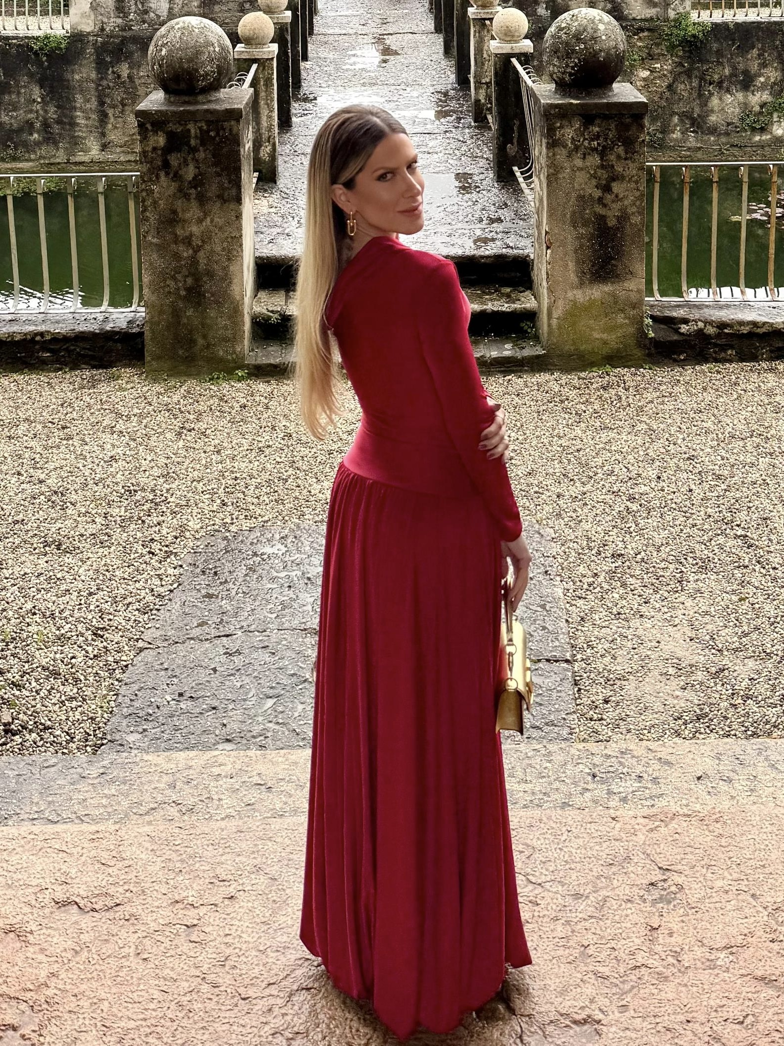 Vestido Balonê longuete na altura do tornozelo, mangas longas com aberturas para inserir o dedo polegar, podendo também ser usado da forma tradicional e anular o detalhe da abertura do dedo.