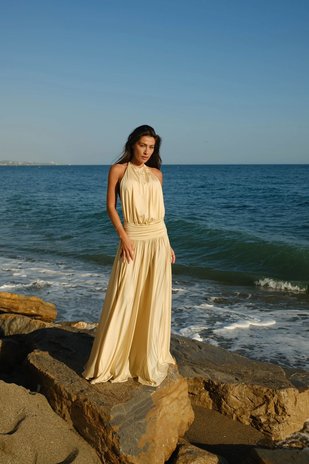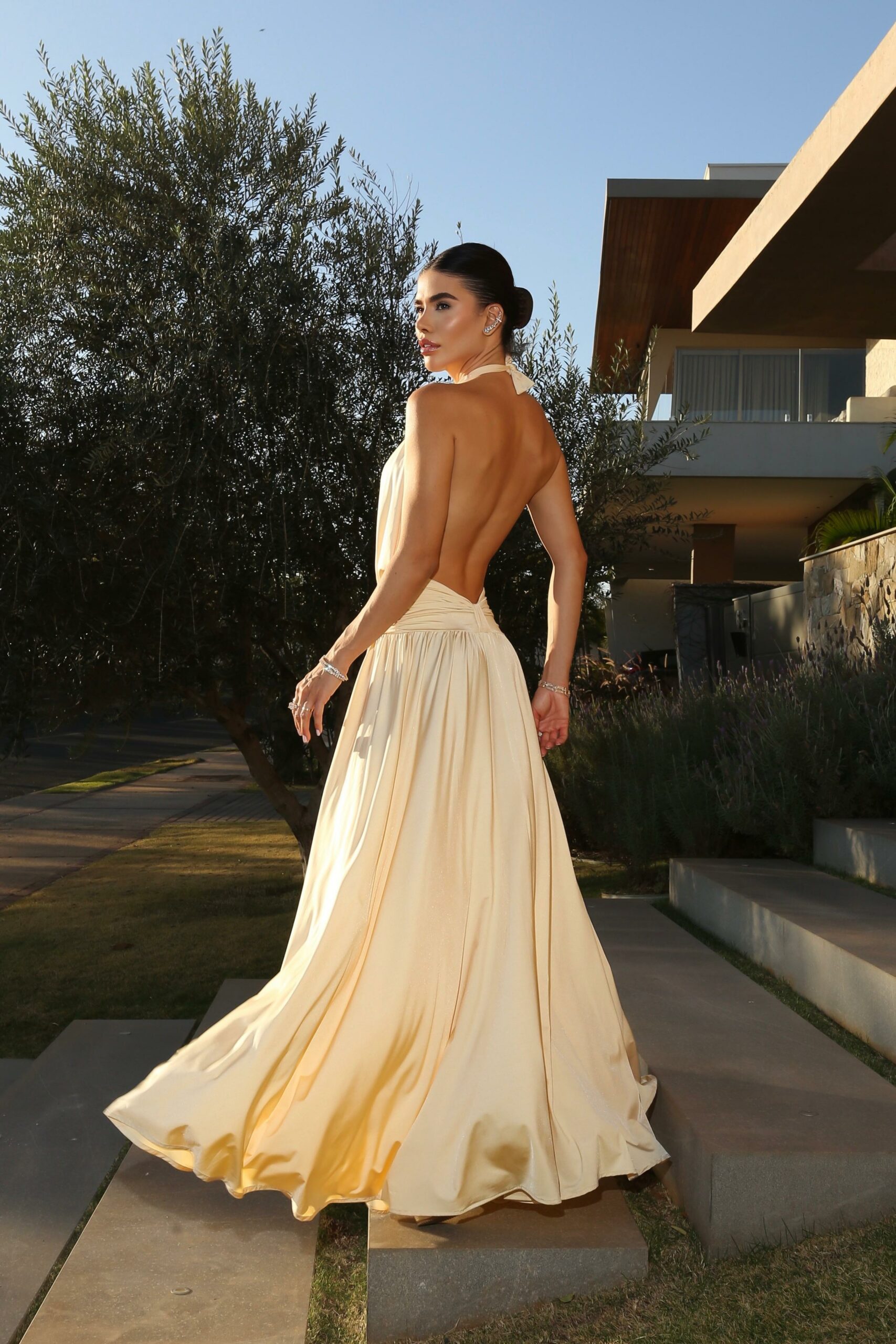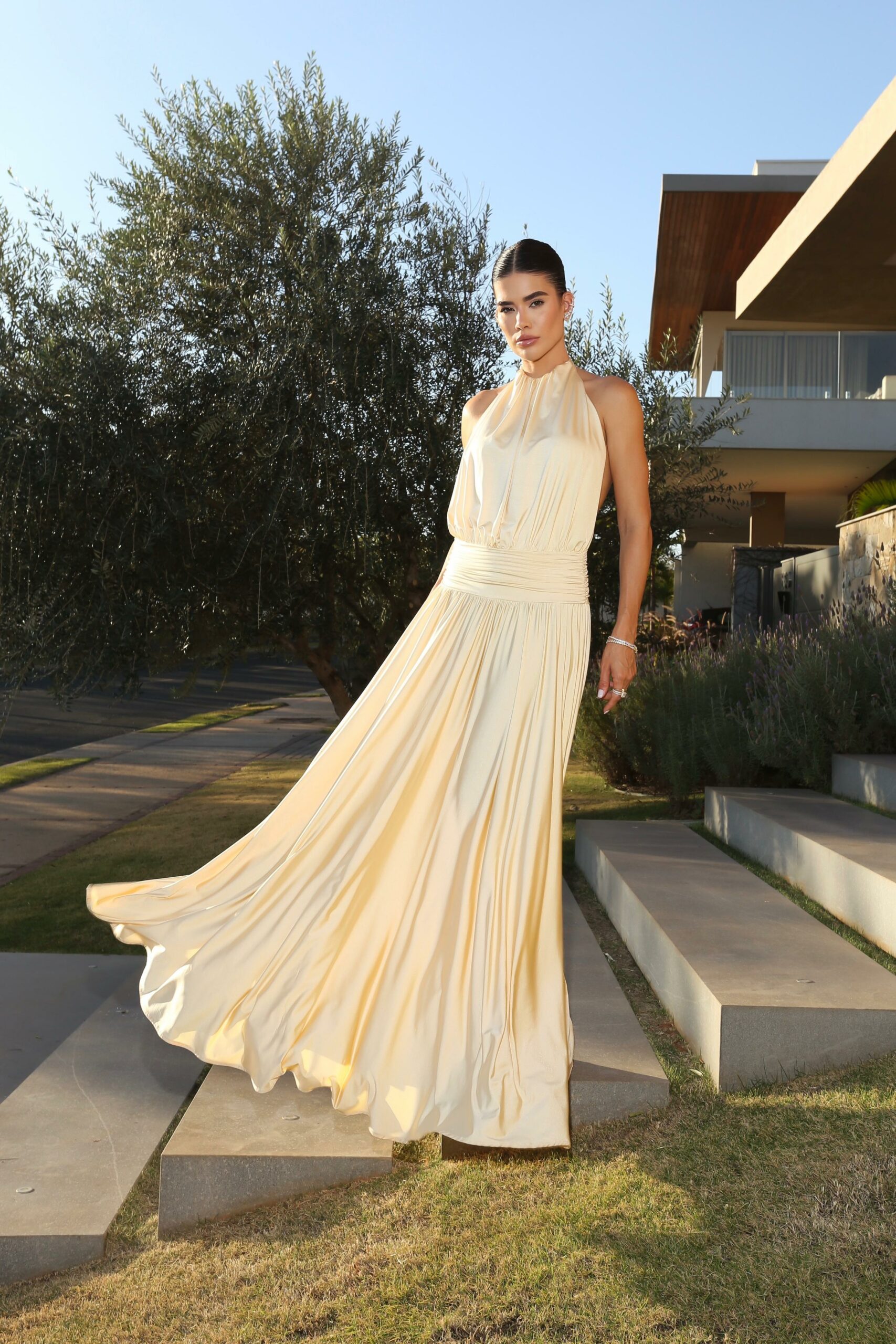 O vestido Áurea é feito de uma malha premium shine exclusiva, caimento fluido, super macio e bastante elasticidade. Essa elasticidade, faz com que o vestido modelo o corpo perfeitamente, além da modelagem que é impecável.