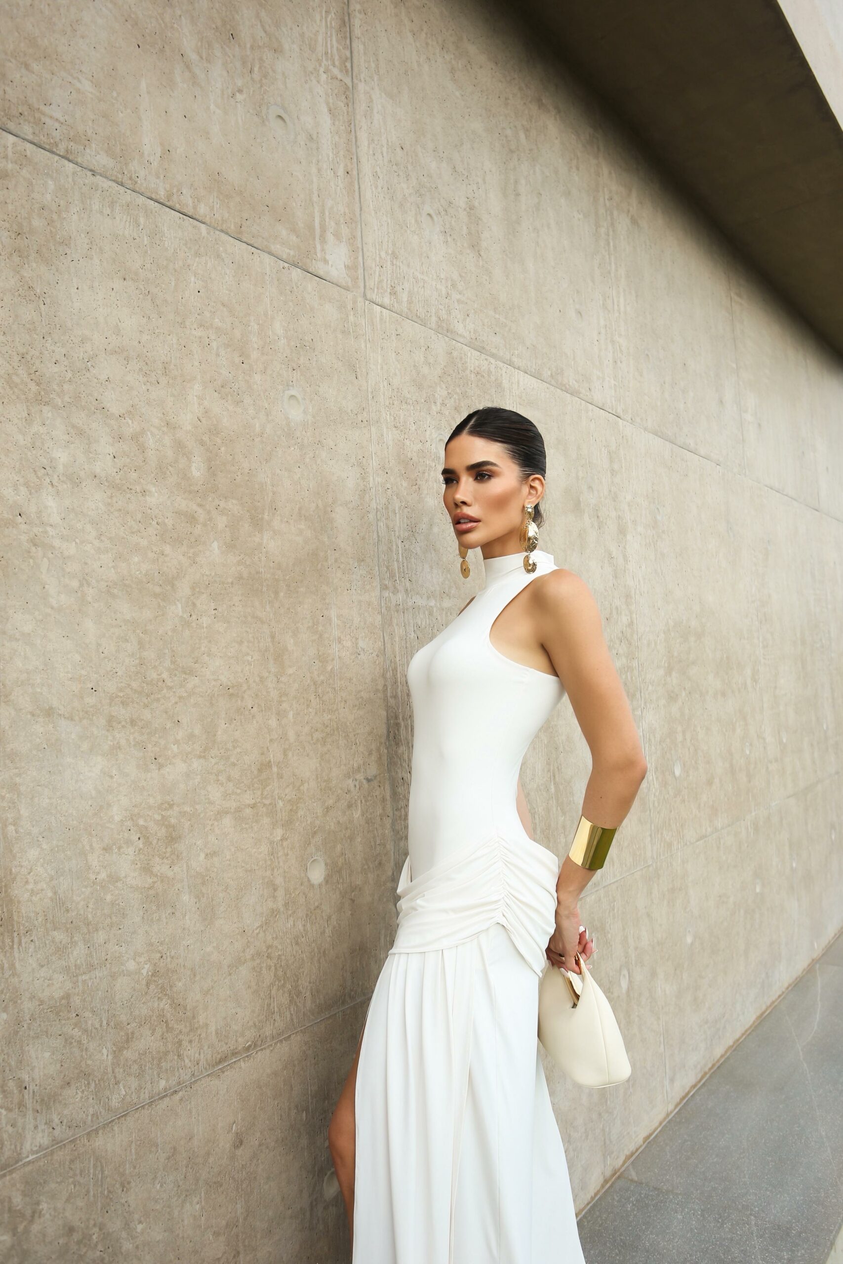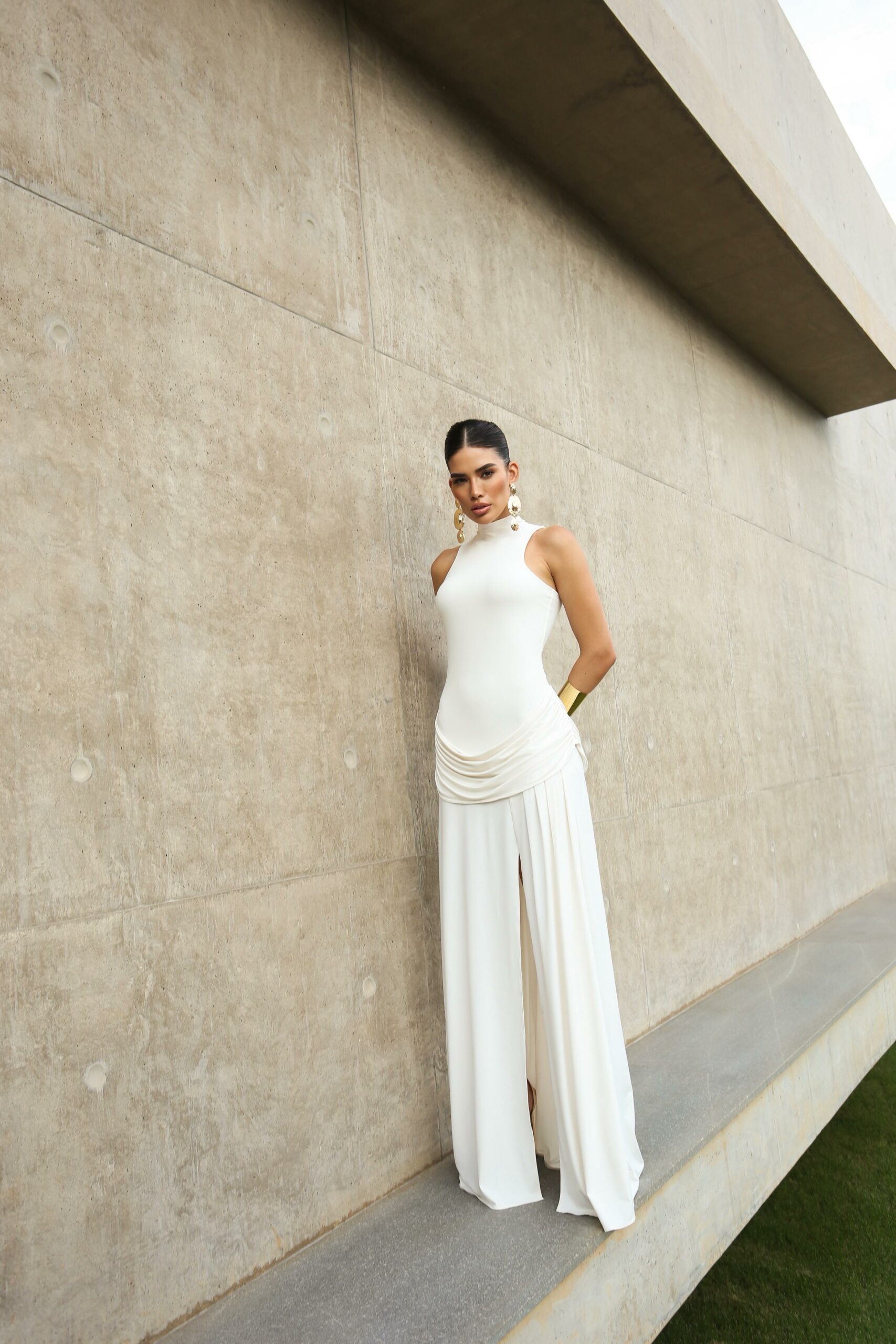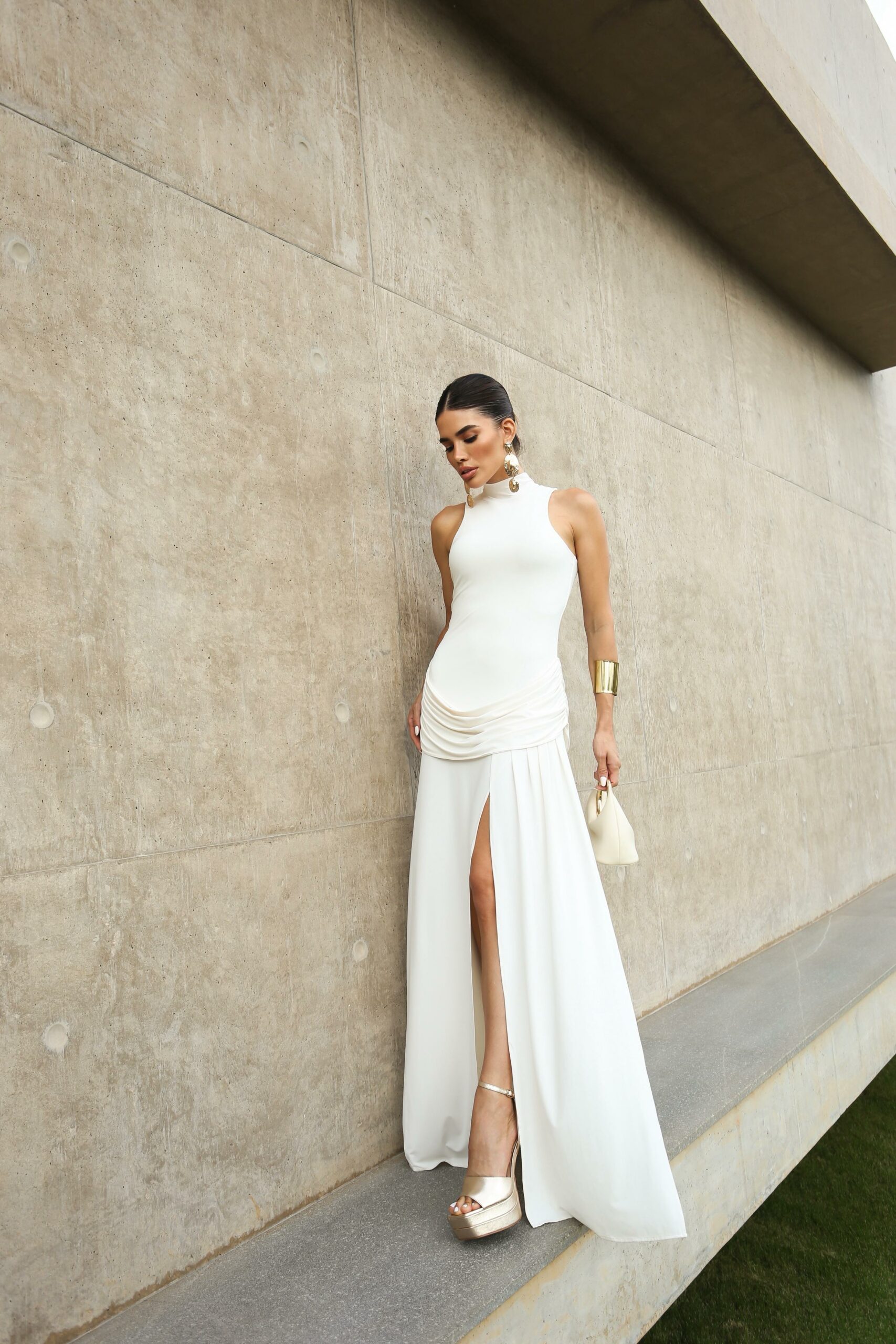 O Vestido Ren é feito em jersey de malha com bastante elasticidade e fluidez. Por isso, modela o corpo perfeitamente.