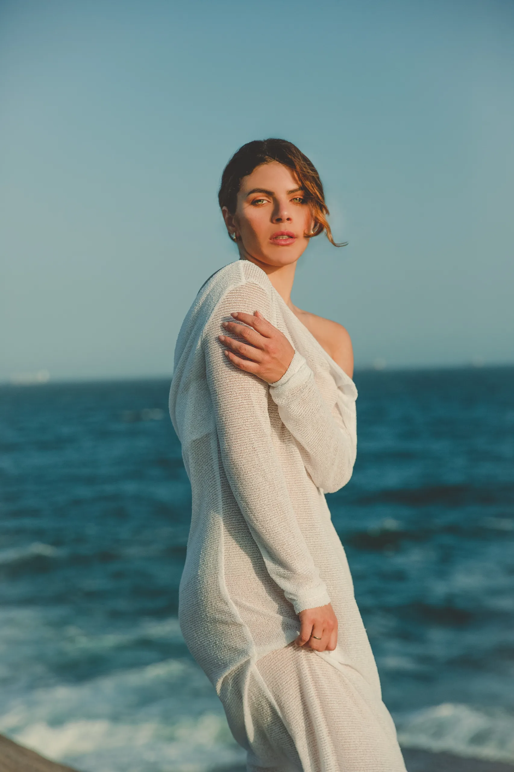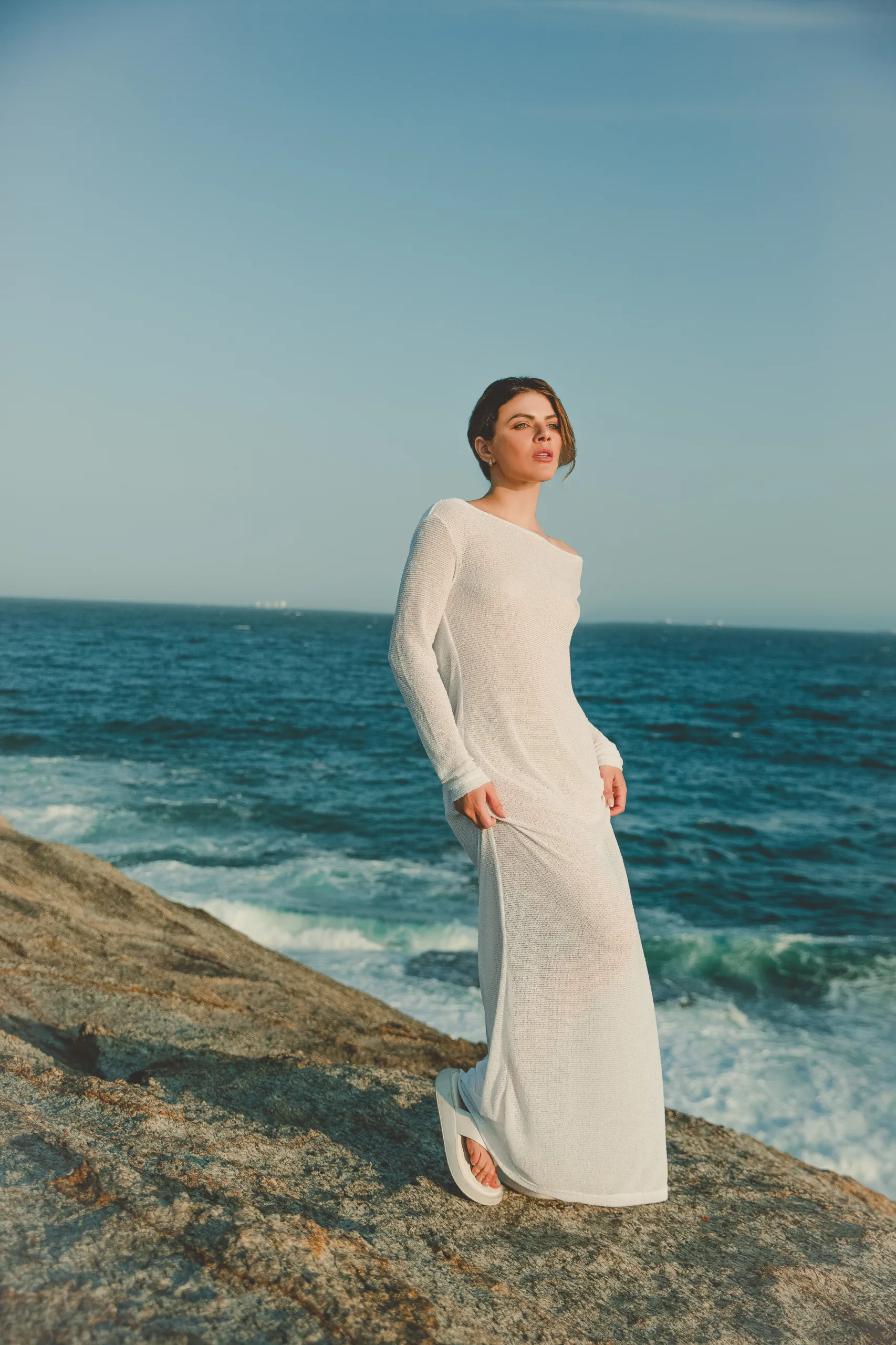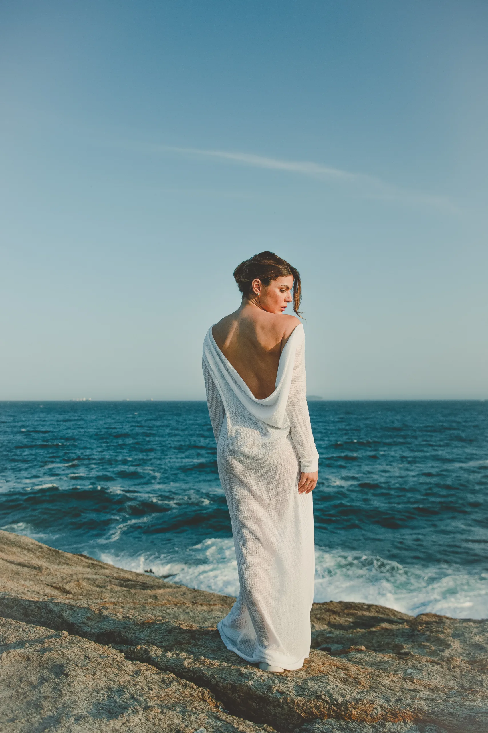 Vestido malha tricô com modelagem drapeada nas costas, também podendo ser usado