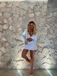 Vestido curto manga longa com recorte frontal que modela o corpo